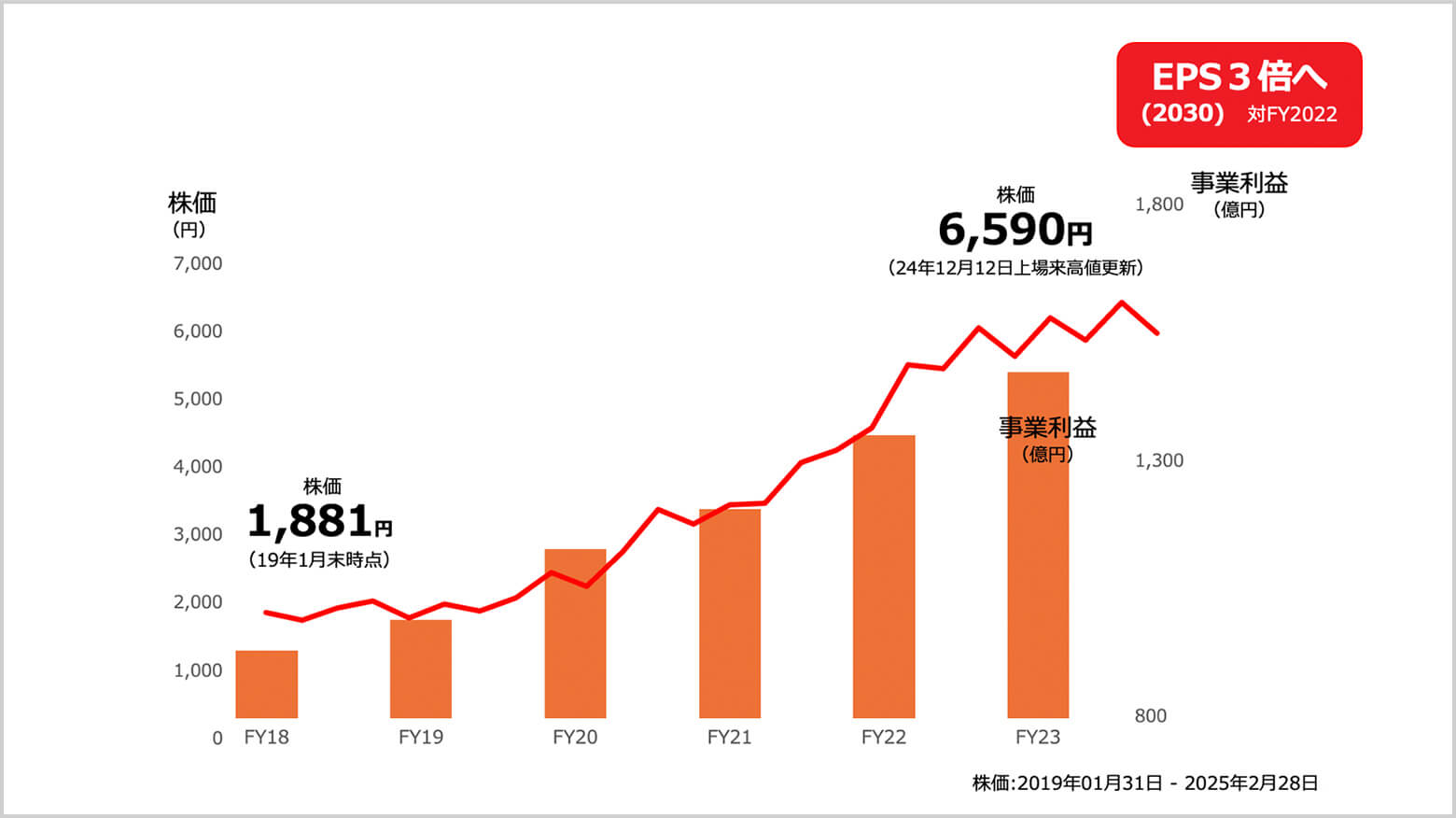 2024年(令和6年)の12月に上場来高値を更新しました。2030年までに「2022年度と比較してEPS*3倍」と目標を掲げ、達成に向けて取り組んでいます。