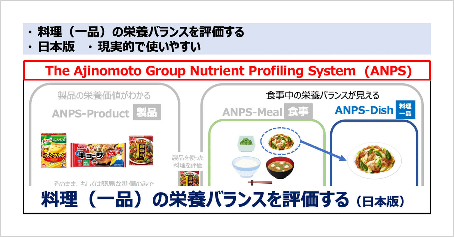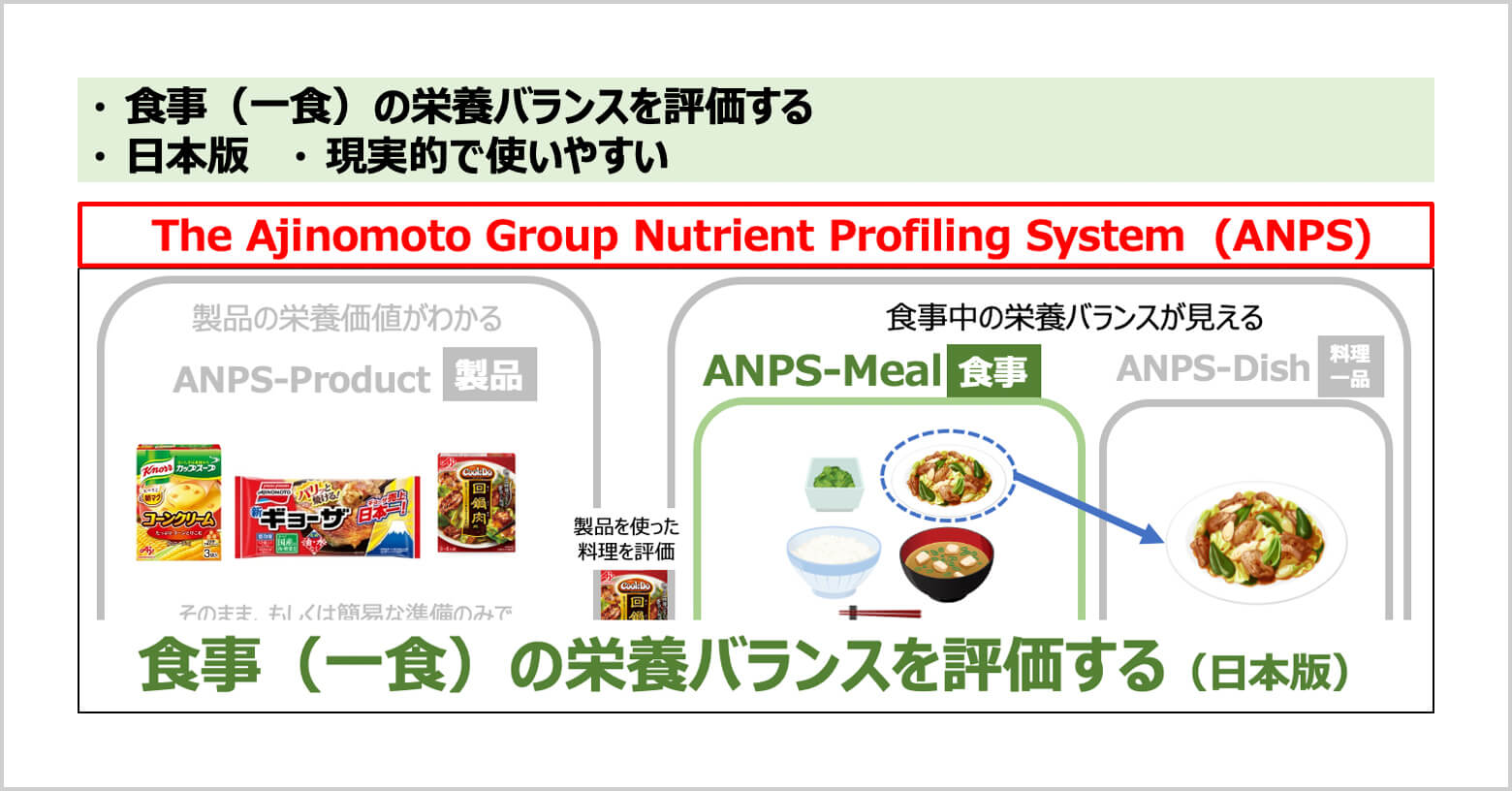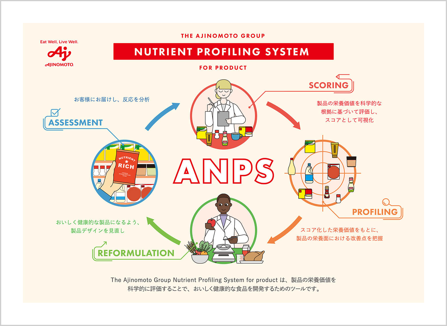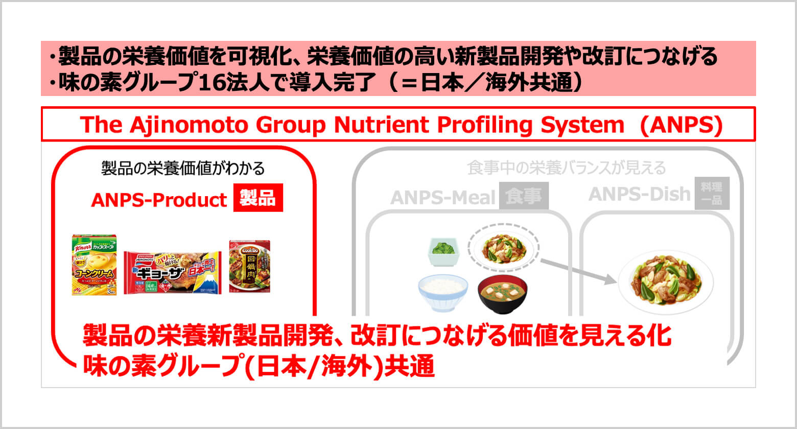 2020年(令和2年)、味の素社が最初に導入した「ANPS-Product(アンプス-プロダクト)」は、すべての味の素グループにおける共通指標としてグループ内の製品の栄養価値を評価し、栄養価値の高い新製品の開発や製品のリニューアルに活用されています。2025年現在日本を含めて13カ国16法人、16のグループ法人で活用しています。
