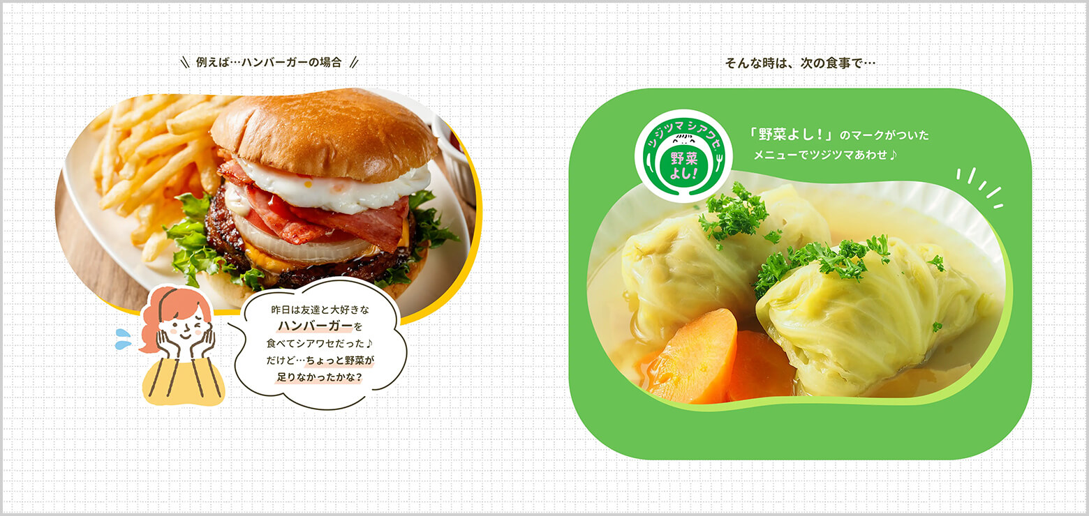 たとえば、昨日はハンバーガーを食べたから野菜が足りない、では、次の食事で「野菜よし!」のマークのついたメニューを食べて、ツジツマをあわせるという考え方です。