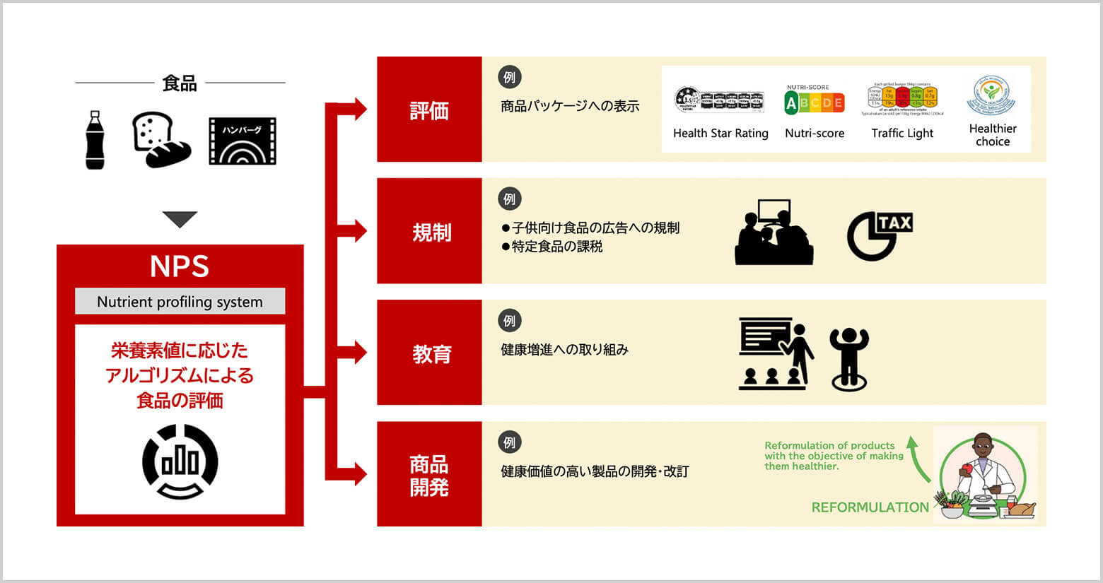 NPSは、「栄養価値に応じたアルゴリズムで食品を評価するシステム」です。食品パッケージに表示して、消費者の栄養に関する理解を助けたり、子ども向け食品の広告への規制や特定食品の課税が行われたり、教育効果として健康増進への取り組みを行うなど、国民の栄養状態をより良い方向へ導くためのツールとしても機能しています。