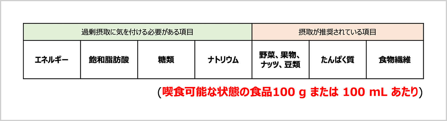 HSRはオーストラリアやニュージーランドで用いられ国際的にも確立している評価システムで、「過剰摂取に気をつける必要がある項目」と「摂取が推奨されている項目」を摂取可能な状態の商品100gあるいは100mlあたりで評価しています。