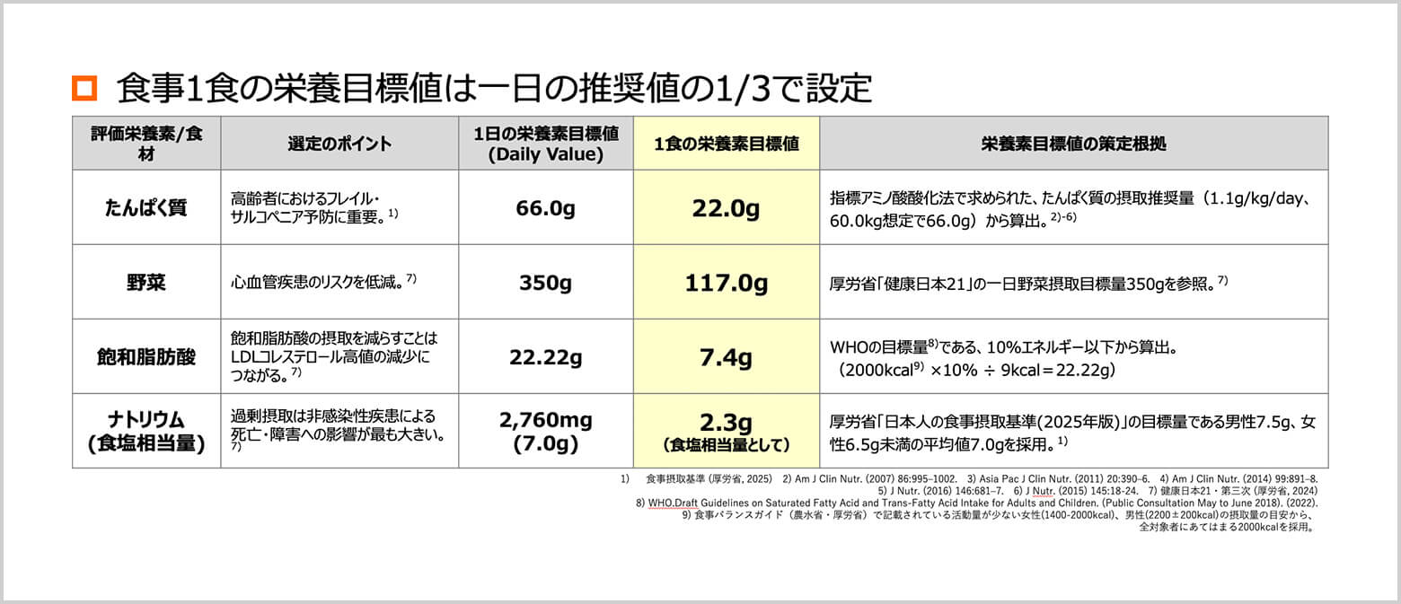高血圧や肥満などの健康課題を抱えている人たちにとって「一食トータルでの栄養バランスと満足感」を満たすためには、一食あたりの「設計価値」も求められてくるでしょう。