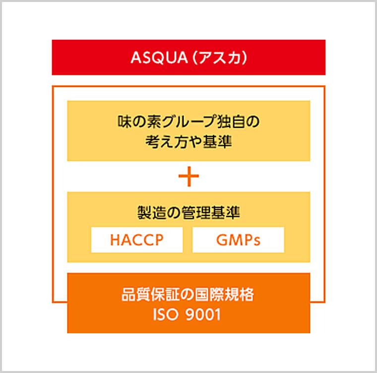 私たちは、国際基準であるISOの考え方を基本にした味の素グループ独自の品質保障システム「ASQUA(アスカ)」で品質を保証します。
