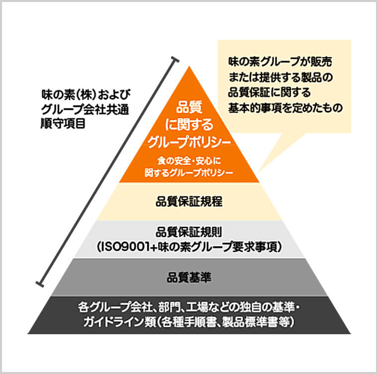 味の素グループでは、「品質保証」を経営や特定の部門だけの取り組みではなく、従業員一人ひとりが自分ごととして取り組むテーマであると考えています。