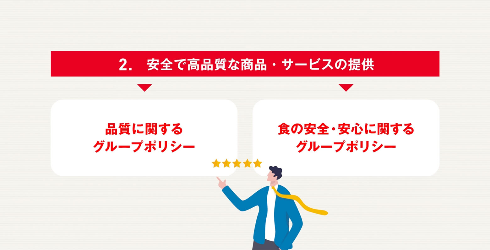 このAGPのなかで、品質に関するポリシーは「2. 安全で高品質な商品・サービスの提供」に含まれており、「品質に関するグループポリシー」と「食の安全・安心に関するグループポリシー」を設けています。
