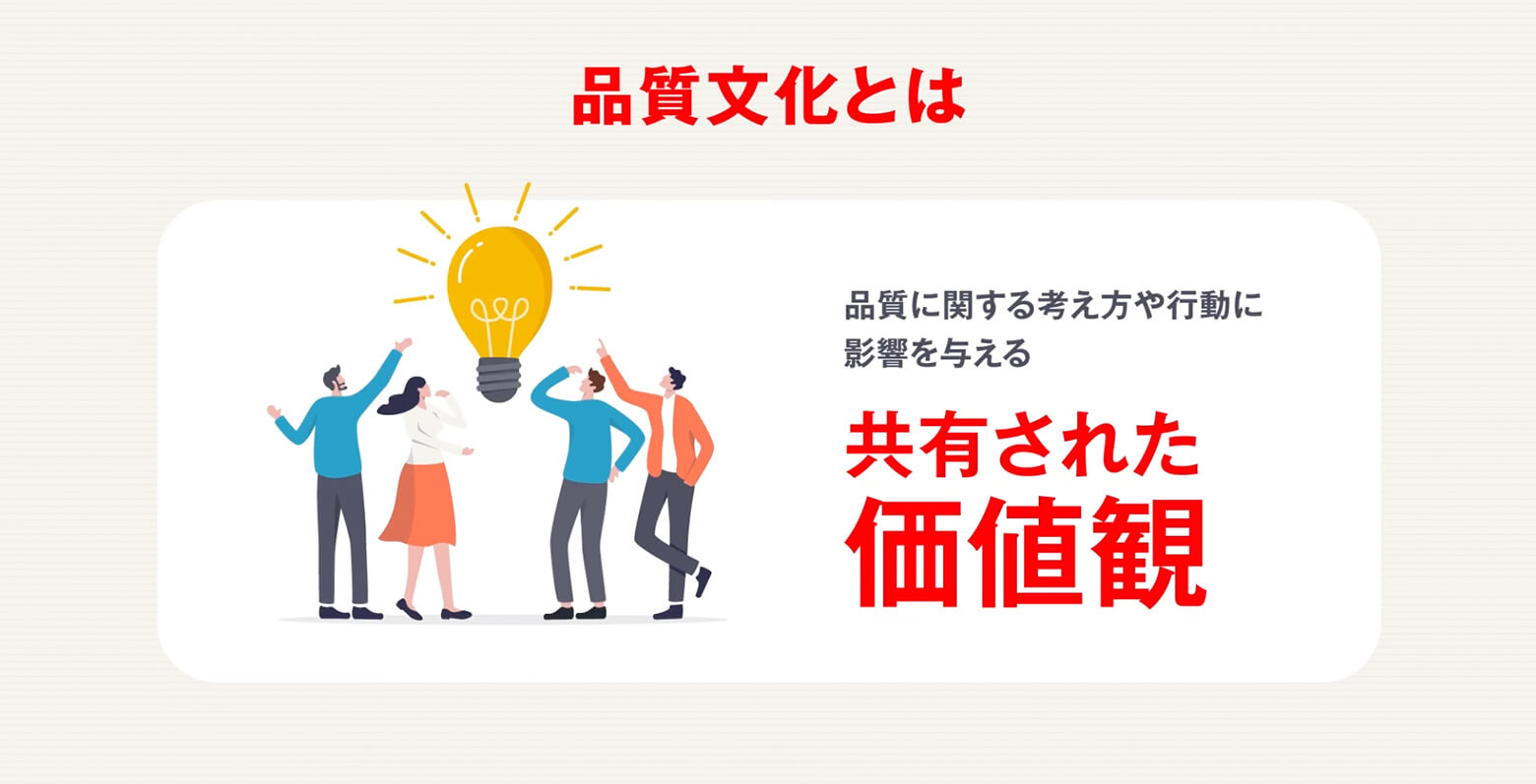 品質文化とは、品質に関する考え方や行動に影響を与える共有された価値観です。