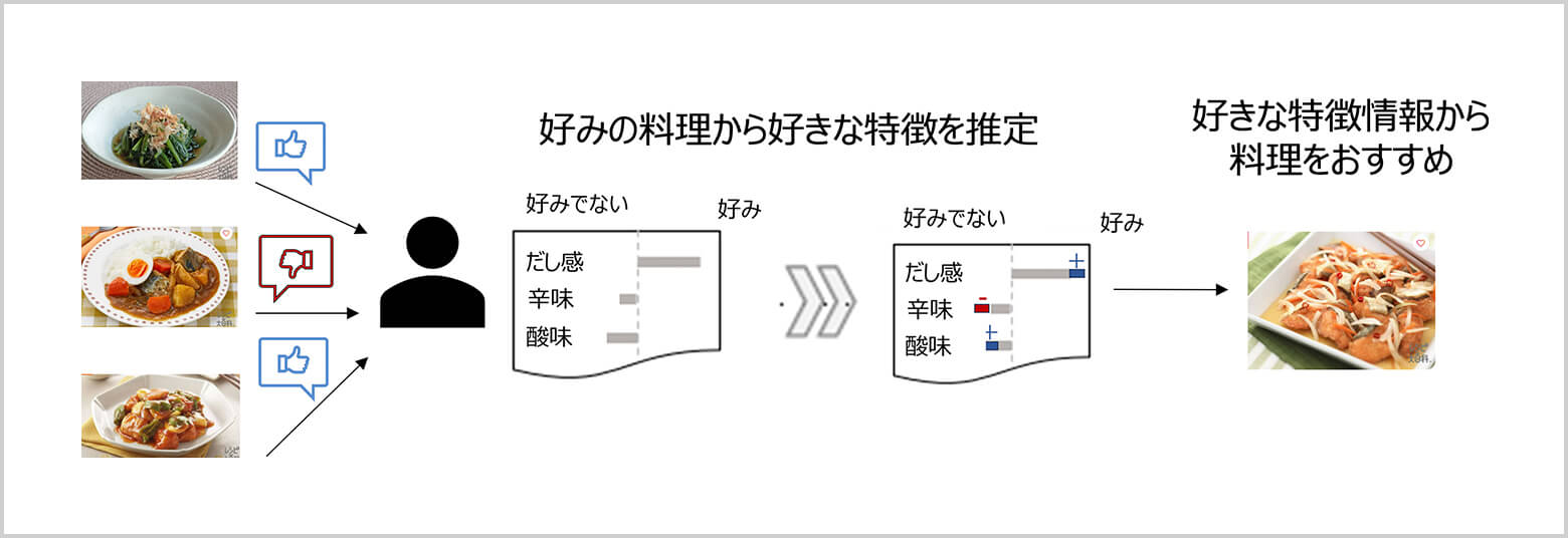 「ハンバーグが好き」「トマトが嫌い」など、料理・食材の好き嫌いは誰にでもありますよね。嗜好性推定AIは、そうした具体的な好き嫌いをもとに、ユーザーの味や風味などの好み(嗜好)を推定して、献立を提案してくれます。