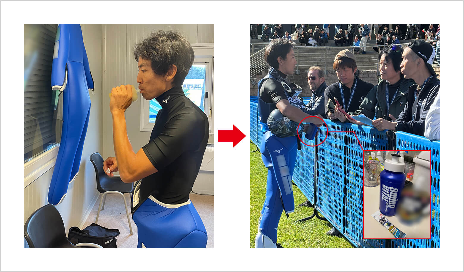 (写真右)本番ジャンプ後、Mixゾーン前からエネルギーミックスドリンク摂取開始