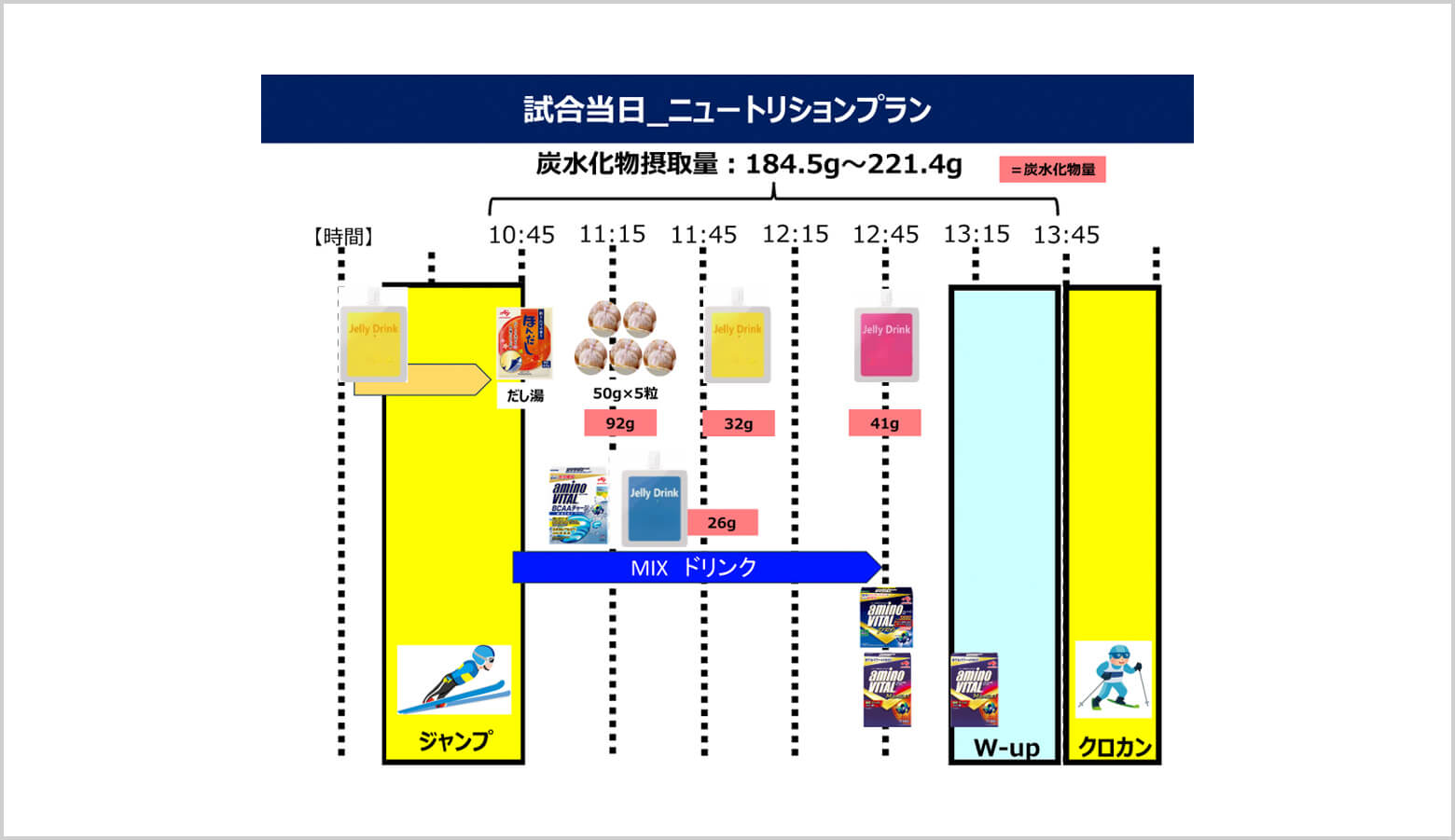 試合当日、最高のパフォーマンスを支える栄養戦略をいかに作り上げられるか。とくにノルディック複合は、ジャンプは瞬発系、クロスカントリーは持久系。相反する体力が求められるという、非常に特殊な競技です。