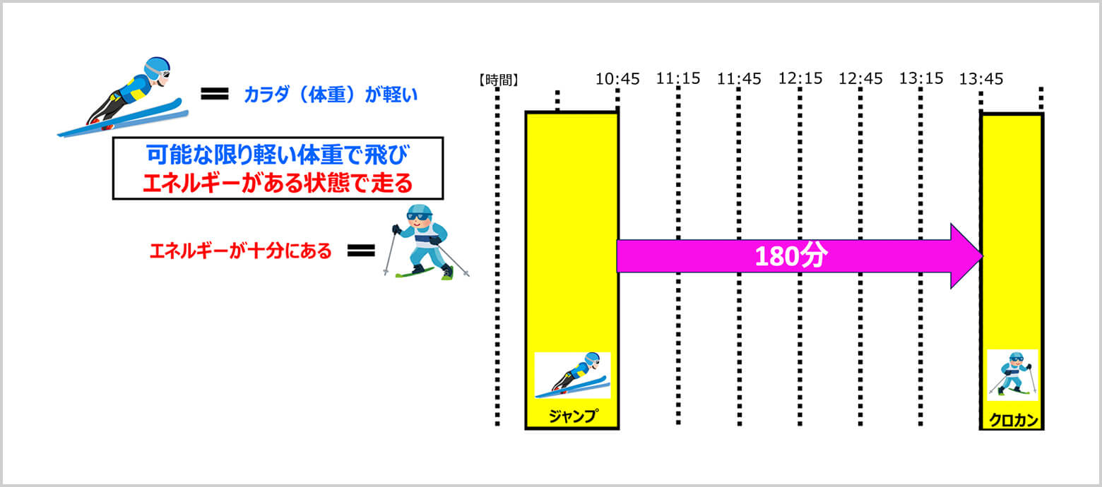 前半のジャンプは可能な限り軽い体重で飛びたいし、後半のクロカンはできる限りパワーを持続させて速く走り切りたい。陸上競技でいうと、走り幅跳びと1万メートル走を同じ日に行うようなもので、つくづく矛盾をはらんだ競技だと思います(笑)