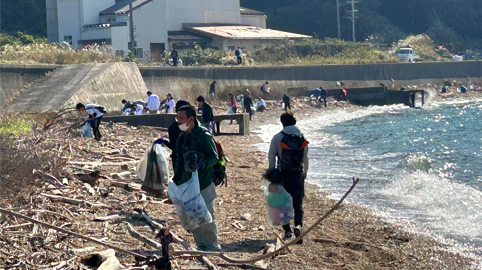 事業所から現場までは、片道1時間以上も電車と船を乗り継ぎ、さらに徒歩で45分という長い道のり。ようやく到着した現場で海岸の清掃活動に取り組みました。