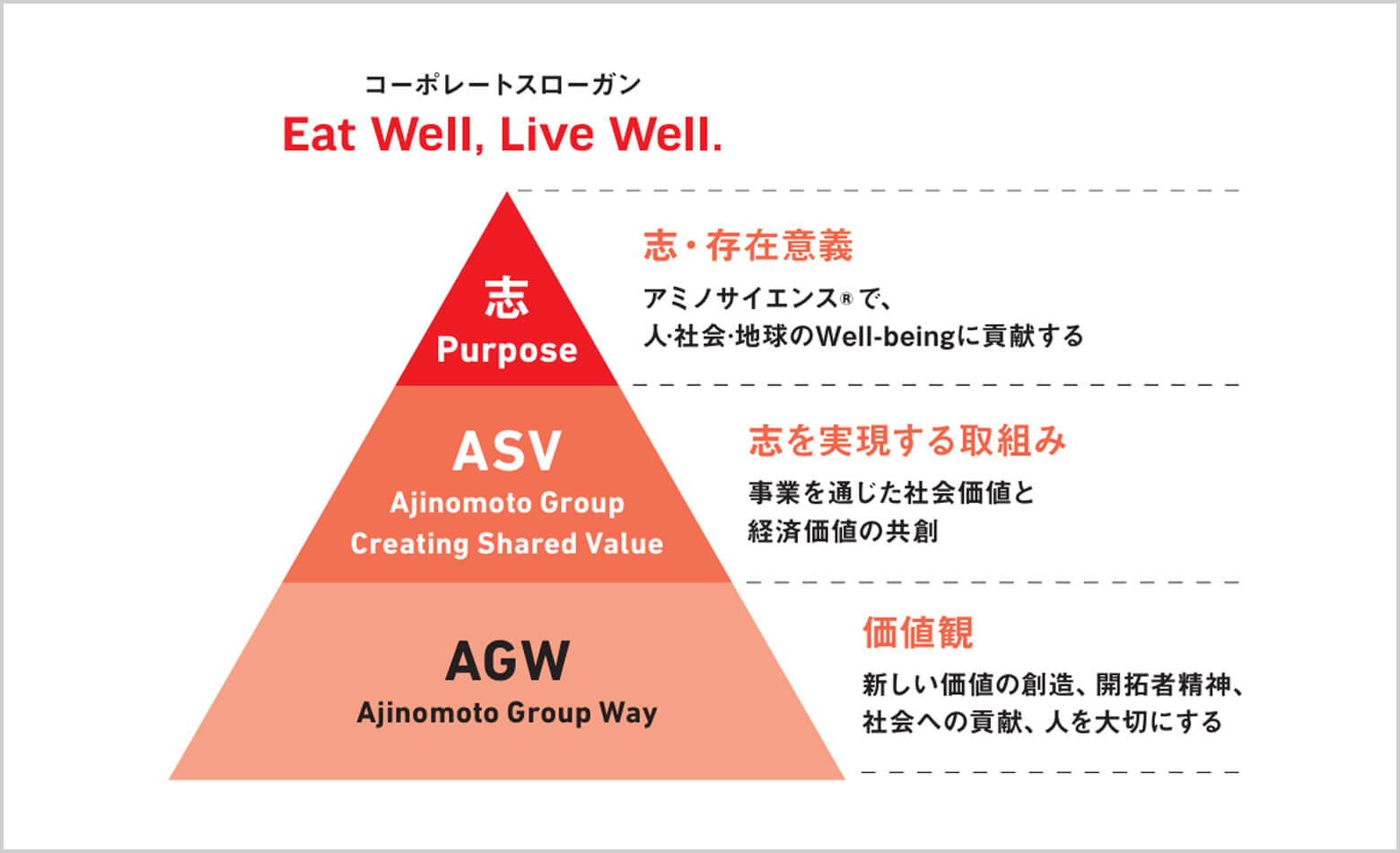 味の素グループのOur Philosophyは、グループが大切にしてきた理念を体系化したものです。ピラミッドにたとえるなら、最上位にパーパスである「アミノサイエンス®で、人・社会・地球のWell-beingに貢献する」が位置し、その土台をASV(Ajinomoto Group Creating Shared Value)と、AGW(Ajinomoto Group Way)が支えています。
