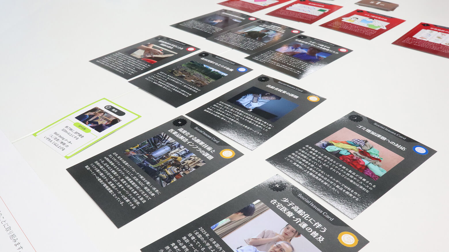 それぞれのテーブルに配布された「社会課題カード」(手前)と「アミノサイエンス®カード」(奥)