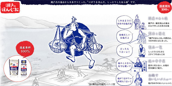 また、味わいにも個性があります。たとえば海水から作られる「瀬戸のほんじお」には、同じく海水からとった天然のにがり成分(カリウム、マグネシウム、カルシウムなど)が含まれています。そのため、いわゆる「塩カド」のとれたまろやか~な味わいに。さらに、にがりが入っている分しっとりした口あたりになるのだそうです。