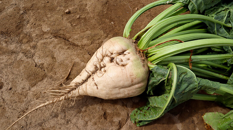 てん菜はカブのような形をした野菜で、別名さとう大根。北海道がおもな産地です。温暖な土地で育つサトウキビとは、見た目も産地も大きく異なるわけです。