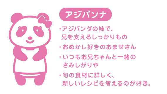 生まれつきカラダの模様がエプロンな、パンダの男の子。2005年、商品「味の素_」の良さをもっと多くの方に知ってほしい、という思いから誕生し、2015年に会社のコーポレートキャラクターになりました。キャラクターをパンダにした理由は、若い方、お子様のいらっしゃるお母様をはじめ世の中の人々に広く愛されるような、親しみやすさを感じていただきたかったからです。(「教えて!"アジパンダ®"」より)