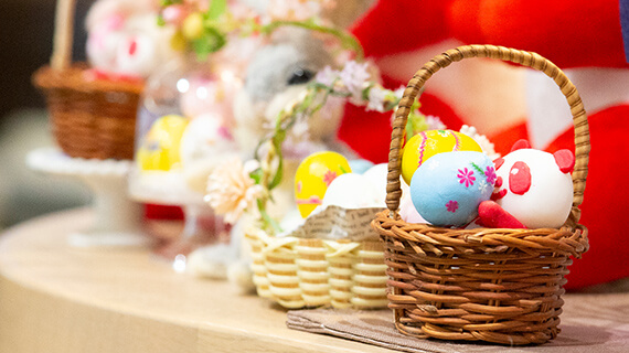 「季節を感じられる飾りを目指しています」と斉藤さん。この日はイースターバニーに扮したアジパンダ®とアジパンナ®。(ひゃー!かわいすぎる) 大きなアジパンダ®の手には花見団子が!